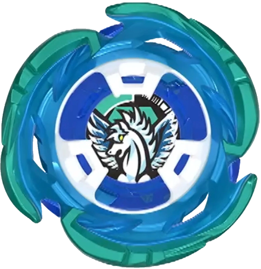 The three blades create excellent Upper Attack and Smash Attack. AeroPegasus features six "air duct" holes, which are intended to improve aerodynamic performance by reducing drag from air moving through the holes. As part of the Unique Line, AeroPegasus has resin Launcher Hooks instead of metal ones, which increase Outward Weight Distribution (OWD). AeroPegasus also has a Unique Line gimmick: it has a "Double Metal Coat", with a coat of blue paint and another coat of green paint.