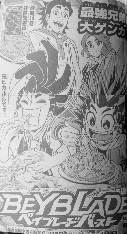 This chapter starts off in the cafeteria of Hikaru and Hyuga's school. Hikaru decides to make cardboard beys to battle with against his friends. Hyuga likes the idea, and he decides to make a cardboard version of Hyperion. The two brothers have a "battle," with Hikaru as the winner. This frustrates Hyuga, who decides to make a bey larger than the table itself. He battles Hikaru and wins immediately, jumping up and down with joy. Suddenly, three men in suits come to the brothers' school and tell them that they have qualified to compete in a blading competition. The brothers ride a limousine and enjoy themselves but get serious when they see the incredible amount of bladers they will have to go up against.