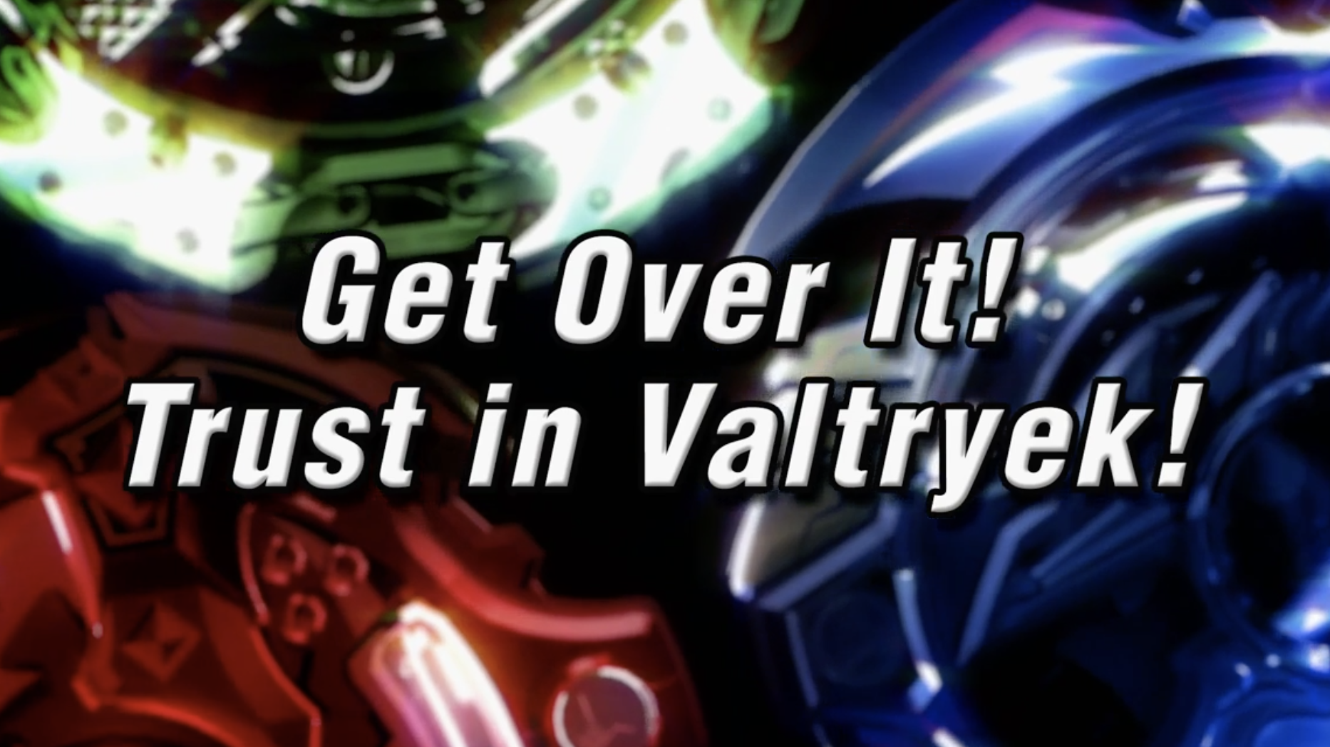 "Get Over It! Trust in Valtryek!" (乗り越えろ!相棒を信じて!!, Norikoero! Varukirī o shinjite!!; Get Over It! Believe in Valkyrie!!) is the tenth episode of the Beyblade Burst anime. It first aired on June 6th, 2016 in Japan, and later aired on December 3rd, 2016 in Canada and on December 30th, 2016 in America.