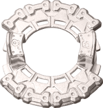 Takara Tomy's Curse is a right-spin Defense Type Ring that features five main wings with three small blades each, positioned in a way that is meant to minimize recoil. The spaces between each of the five wings are occupied by free-spinning plastic "rollers" attached only from underneath. As a part of the Superking Layer System, Curse is compatible with any right-spin or dual-spin Superking Chip and Chassis.