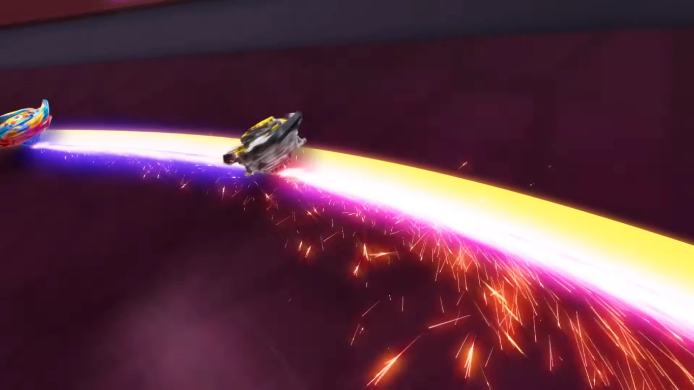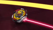 Destruction Belfyre builds up speed by circling around the edge of the Beystadium and rams into the opposing Beyblade with the Destruction Blade, delivering either a power slash attack or ram.