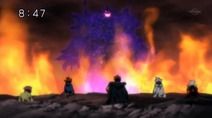 Most of the Legendary Bladers leave to discuss a strategy to defeat Nemesis, but Ryuga stays to fight Rago. During this time, Dynamis visits Aguma and convinces him to join him. When they set off to stop Rago, they are ambushed by Johannes and the Nemesis Bladers. Dynamis fights hard and the others along with Aguma who came to help. The Bladers defeat the servants of Nemesis and move on.