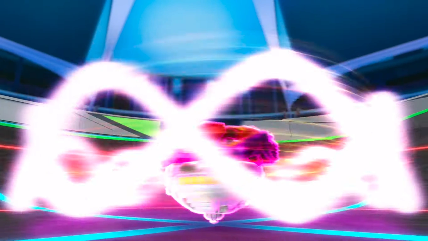 While spinning in the center, Eclipse Genesis creates an infinity-style symmetrical chain barrier around. When an opponent makes contact with the barrier, it expands and creates a shockwave that blows the opposing Bey backwards.