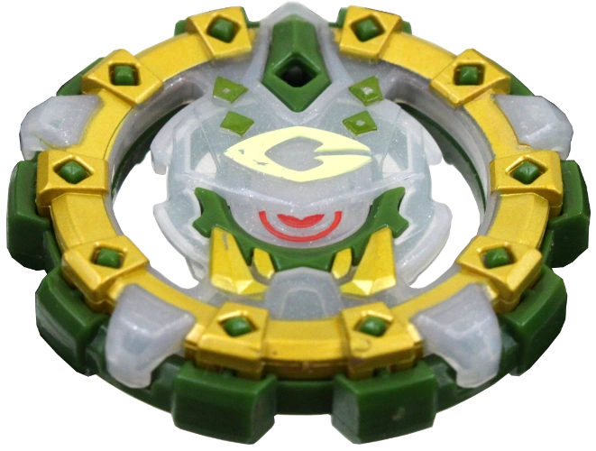 Hasbro's Behemoth Cyclops C4 is a round Stamina Type Layer that consists of ten wall-like protrusions with a ring that sits on top of them. This ring surrounds the Layer's center rim, only being interrupted by a large protrusion above the center of the of the Layer. Each of these ten protrusions have ten individual gaps in between five pairs of two protrusions. Five of these gaps are mostly filled in, and each one has a translucent-white plastic protrusion that sits on top of them; these translucent protrusions placed in a star-like formation. In the center of the Layer is a giant monstrous face with a giant eye and large bottom teeth that is depicted facing forward, along with a stylized "C" above the face. The face represents Behemoth Cyclops C4's namesake: the Cyclops, a one-eyed giant from Greek mythology.