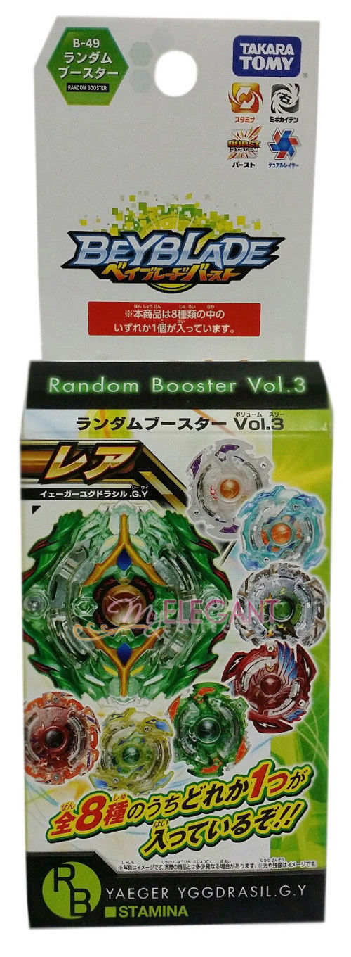 Random Booster Vol. 3 Yaeger Yggdrasil.G.Y (ランダムブースターVol.3・イェーガーユグドラシル.G.Y, Randamubūsutā Vol. 3 Yēgā Yugudorashiru.G.Y) is the third Random Booster released by Takara Tomy as part of the Beyblade Burst series. It was released in Japan on July 16th, 2016 for 972円.