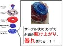 Circle Flat (CF) is the first new Performance Tip of the Beyblade: Shogun Steel toyline. Circle Flat is designed to work in the ZeroG stadiums and their swaying gimmick, and as such includes a large circular ring. The large ring grips the sides of the stadium, so it can go higher and shake the stadium. The ring features six circular designs. The size of the flat tip is the same as Wide Flat (WF).