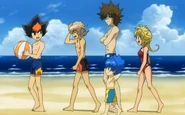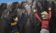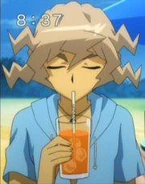 A few days later, Shinobu was surprised when he saw Zyro Kurogane running uphill, tied to three weight pullers in training. Shinobu wondered what Zyro was doing, yet Zyro did not see Shinobu.[2] Afterwards when Shinobu lost to Zyro in a battle in the Zero-G Stadium, Shinobu joined Zyro's team. He teamed up at an Synchrom partner with Zyro and beaten Kite and Eight. Then he battled Takanosuke and won with a new special move.He with to the beach and found a sea monster named Gen. Later he battled Sakyo and lost.