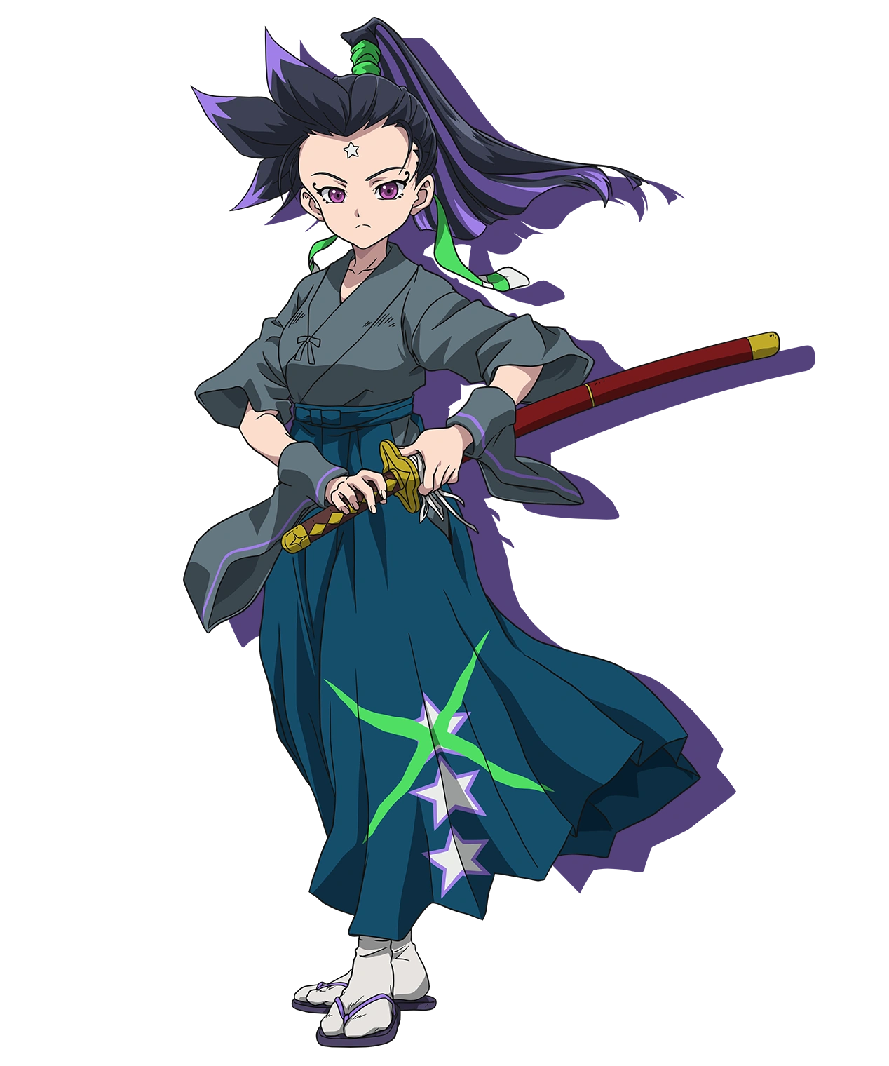 Tenka is a girl of average height, with black and violet hair that she has tied in a ponytail, has violet eyes, and a mark of a white star on her forehead. She wears a hakama attire with three white stars outline with purple, on the top marked with a green "X" on it. Like her mother, Tenka possesses triangular teeth. On occasions, she would wear a white hoodie with a purple star over her hakama attire.