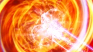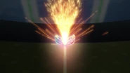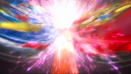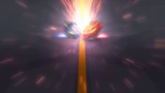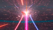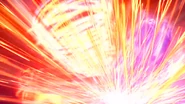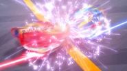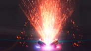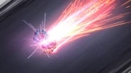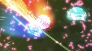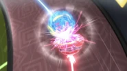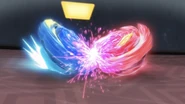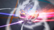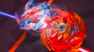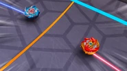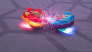 As they charge and collide toward one another, Helios and Hyperion build up speed as their Ring blades grind against each other while rotating in their respective spin directions, creating sparks and ram into the opposing Beyblades with combined force and power.